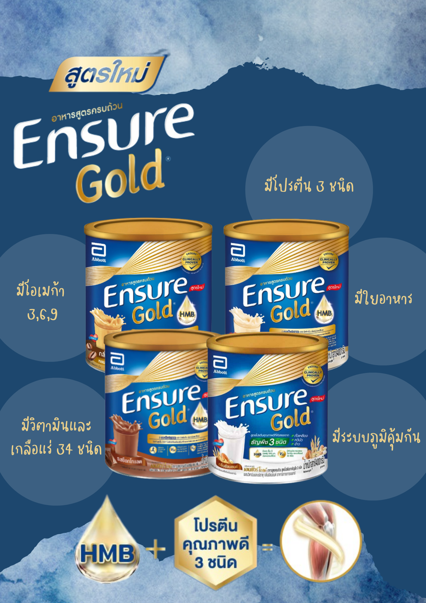 เอนชัวร์ โกลด์ คือ อาหารสูตรครบถ้วนเสริม เอช เอ็ม บี พร้อมวิตามิน แร่ธาตุ และใยอาหาร เอนชัวร์ โกลด์ ช่วยให้ร่างกายแข็งแรง สามารถใช้เป็นอาหารมื้อหลัก หรือเป็นมื้อเสริม รสชาติดี ชงละลายง่ายทั้งในน้ำเย็นและน้ำอุ่น
